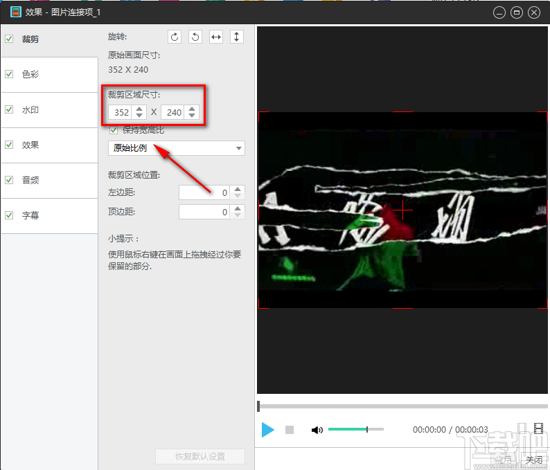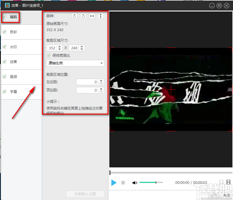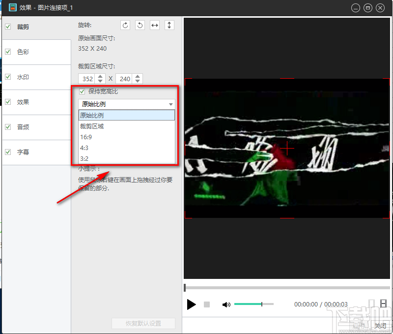 4.在效果设置页面中,我们在页面左上角找到“裁剪”并勾选,其旁边会出现很多的裁剪选项。
