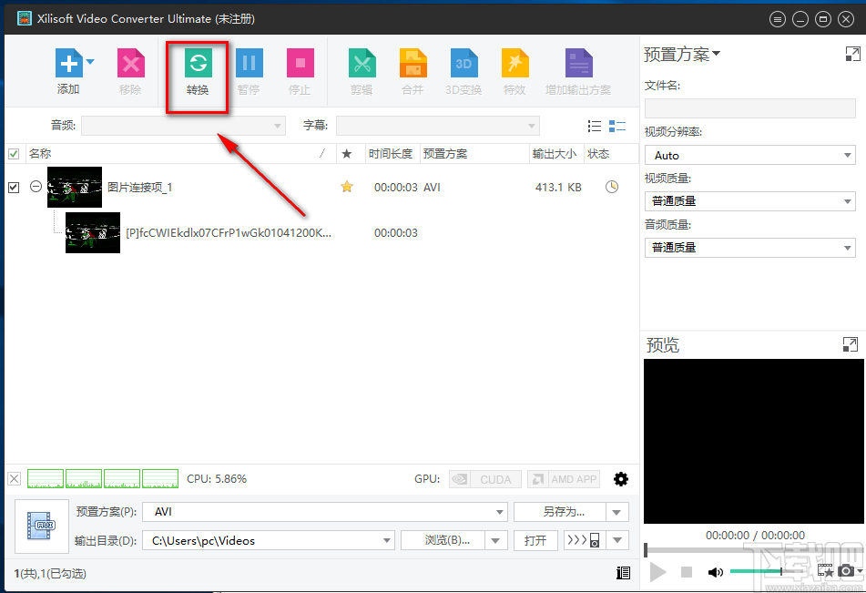 10.完成以上所有步骤后,我们在界面左上方找到“转换”按钮,点击该按钮就可以开始裁剪视频画面,并将其保存在指定的文件夹中。