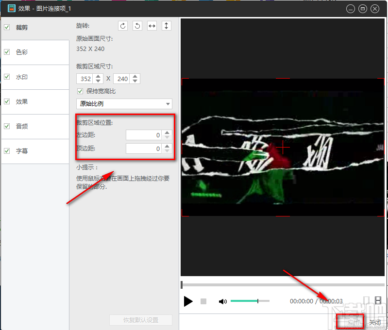 7.然后在界面左上方找到“裁剪区域位置”选项,我们分别点击该选项下方的左边距、顶边距两个选项后面的上下按钮,并根据自己的需要对这两个参数进行设置;随后再点击页面右下角的“应用”按钮即可。
