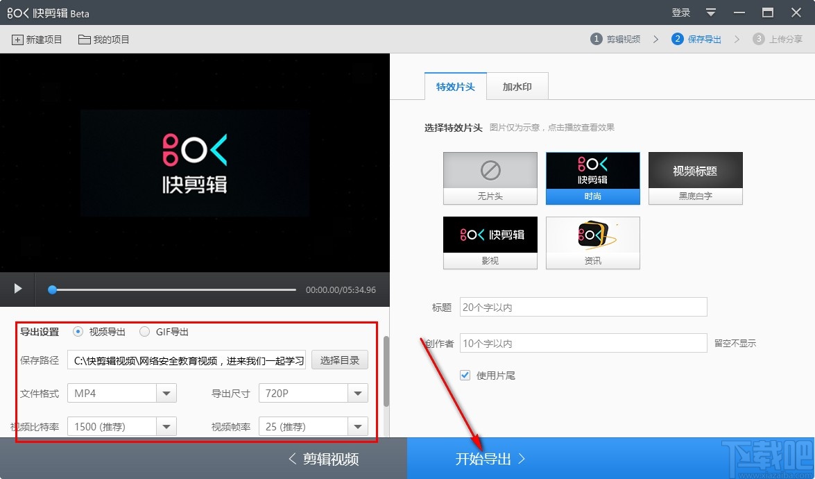 6.点击导出视频按钮进入到导出界面之后,我们可以根据自己的需求对视频的各项参数进行设置,设置之后点击右下角的开始导出按钮即可。