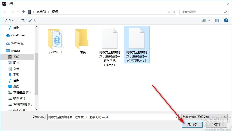 2.点击本地视频按钮之后就会打开一个选择视频文件的界面了,我们在界面中选中视频文件之后点击右下角的打开按钮。