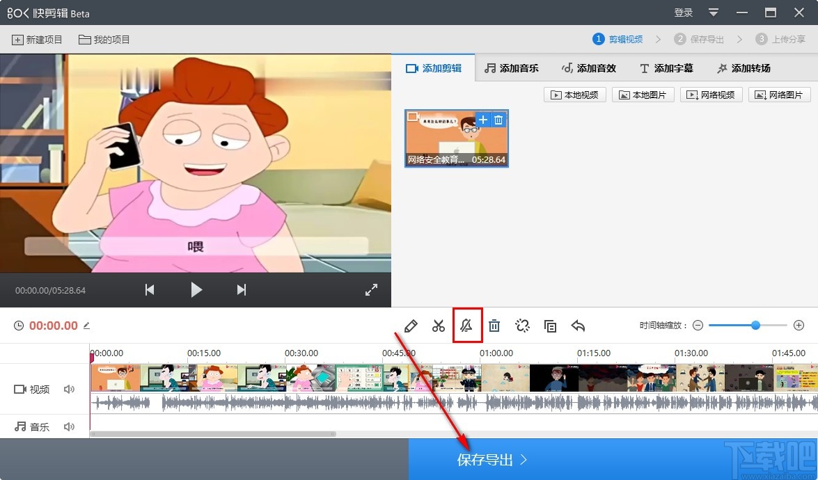 5.点击这个静音图标之后就可以将视频处理为静音了,这时静音图标显示为有斜杠的,就表示为静音状态,接着点击保存导出按钮即可保存处理操作将视频导出。