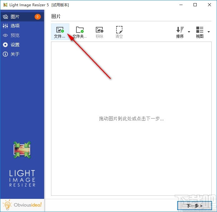 1.点击首先第一步我们打开软件之后,在软件界面的左上角点击添加文件图标,准备添加想要处理的图片。