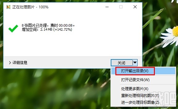 6.点击确定按钮之后软件就会自动开始处理操作,处理完成之后会显示处理结果界面,点击右下角的关闭按钮右边的倒三角图标,在打开的选项中选择打开输出目录即可查看图片。