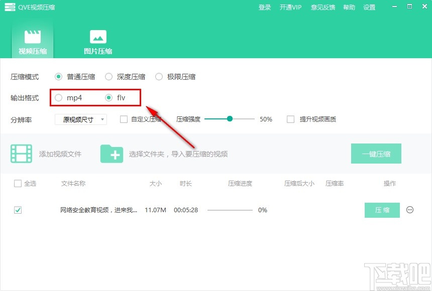 4.选择好压缩模式之后,下一步需要选择输出视频的格式,在MP4格式和flv格式中选择一个自己想要使用的格式即可。