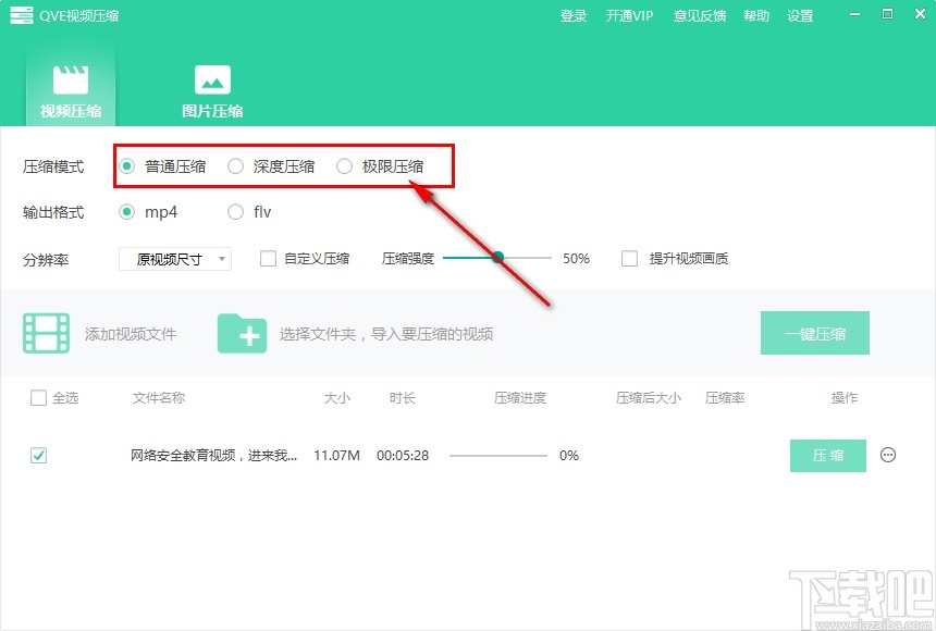 3.点击这个打开按钮之后,我们在上方的压缩模式中选择想要使用的压缩模式,有普通压缩、深度压缩和极限压缩可以选择,根据自己的需求选择即可。