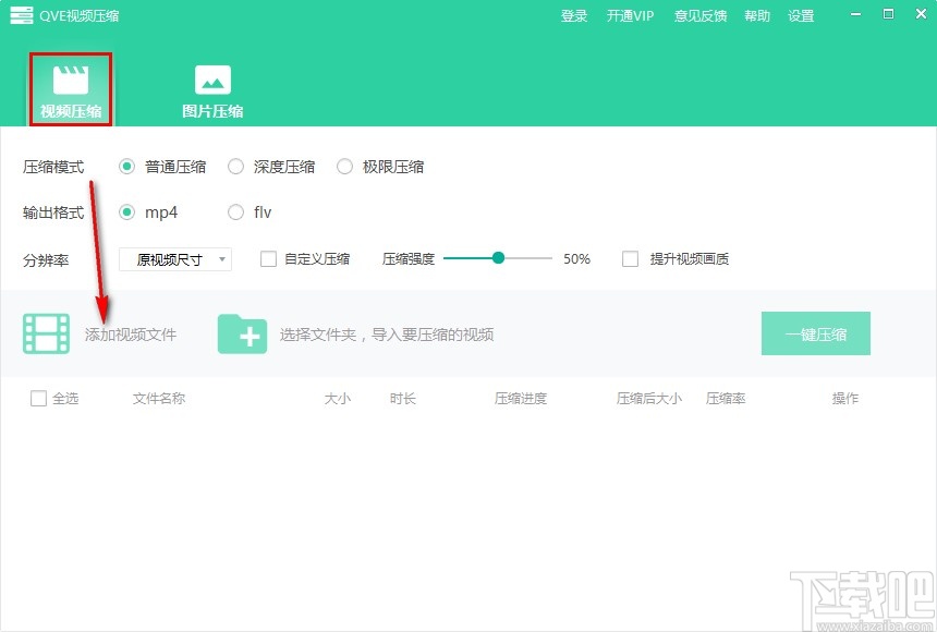 1.首先第一步我们打开软件之后,在软件界面中点击视频压缩功能,然后在界面下方点击添加视频文件选项。