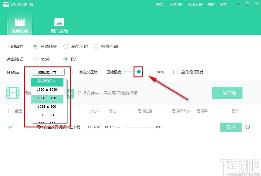5.紧接着下一步是对压缩视频的分辨率进行选择,打开下拉列表选择即可,然后对压缩强度进行自定义设置,点击调整光标左右移动就可以了。