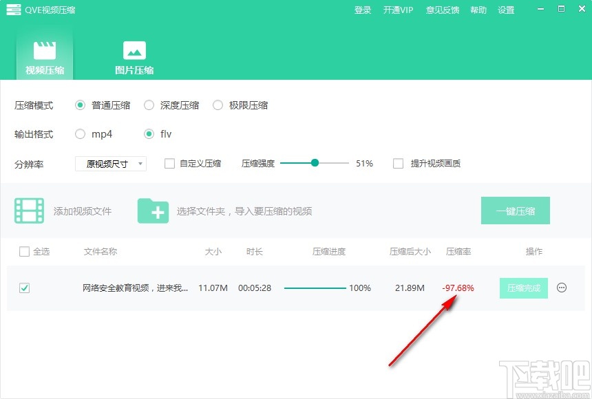 7.等到视频压缩操作完成之后,我们在界面中可以看到视频压缩之后的大小,并且也会显示压缩率,我们就可以了解到压缩视频的效果了。