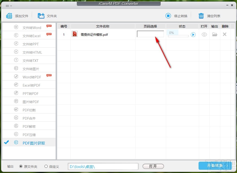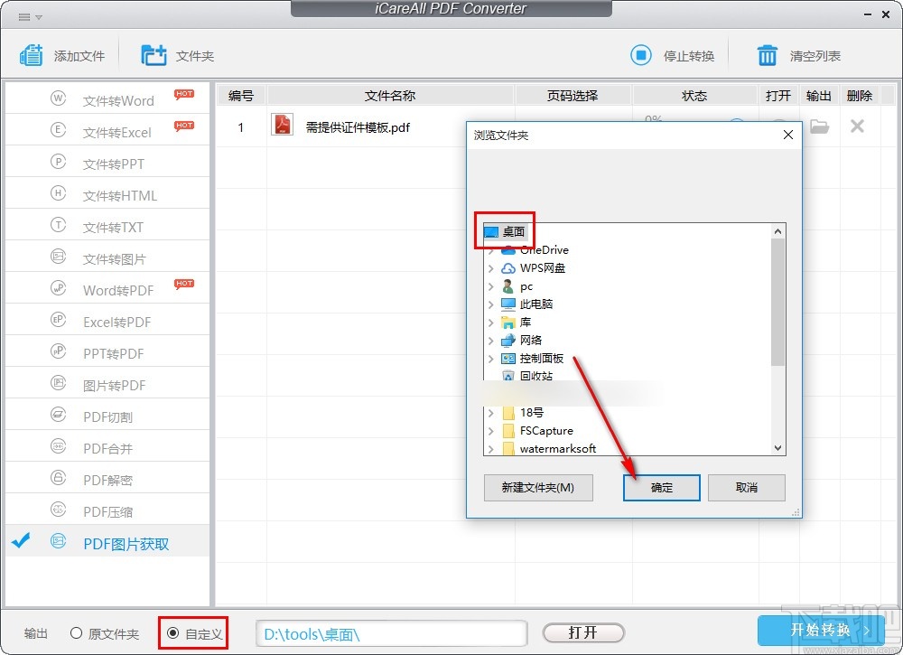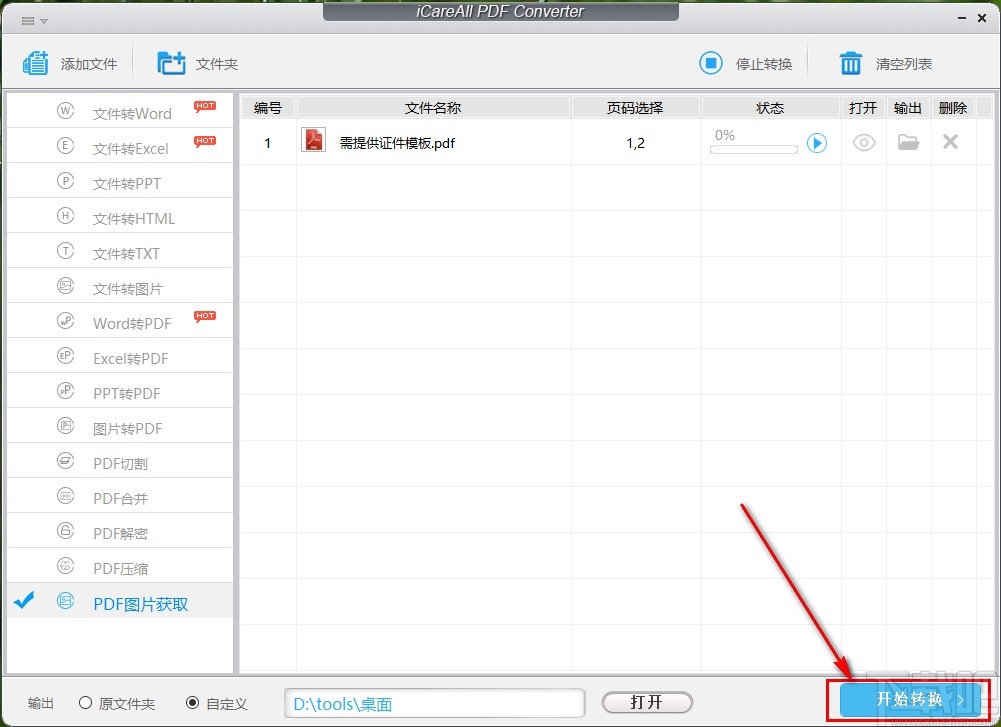 5.点击确定按钮设置好输出保存位置之后,下一步我们点击右下角的开始转换按钮就可以开始提取PDF文件图片的操作了。