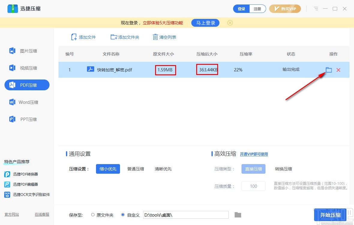 7.压缩操作完成之后,在界面中可以看到原文件大小和压缩后的大小对比,点击右边操作选项下方的文件夹图标即可打开查看压缩之后的PDF文件。