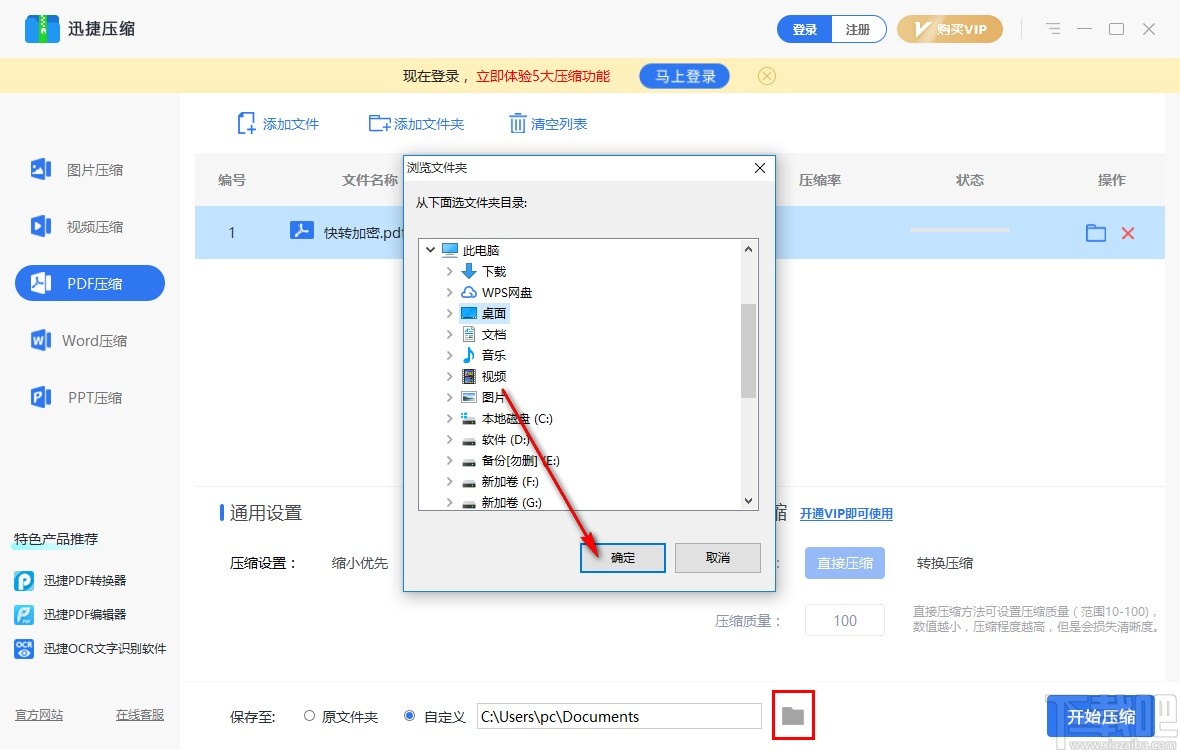 5.设置好压缩选项之后,我们点击下方保存至选项右边的文件夹图标,点击文件夹图标之后在出现的界面可以选择想要输出保存的文件夹并点击确定按钮。