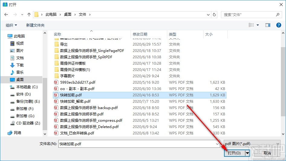 3.点击添加文件按钮之后,下一步在出现的界面中选择想要压缩的PDF文件之后点击右下角的打开按钮即可将它添加到软件界面中。