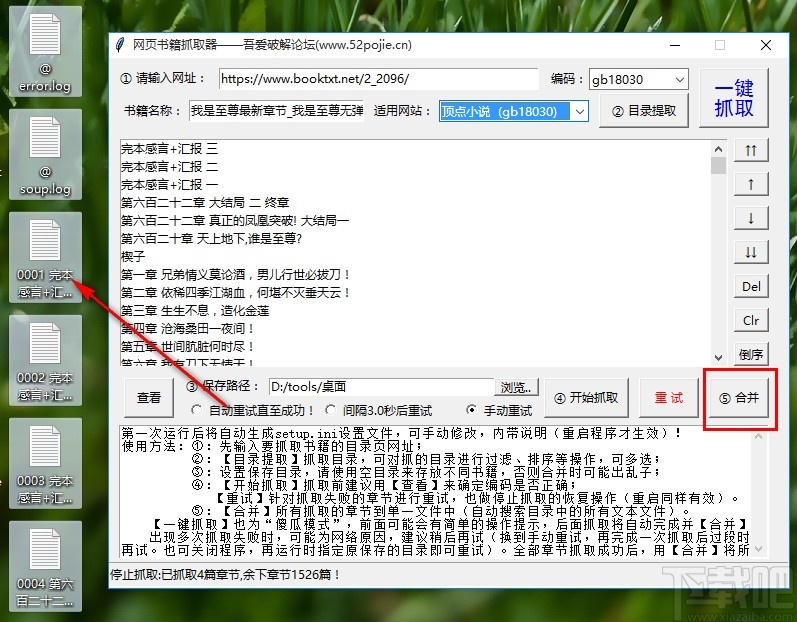 7.等到下载完成,我们在选择的输出文件位置可以看到下载下来的小说TXT文件,点击软件界面右边的合并按钮还可以将它们合并成一个文件。
