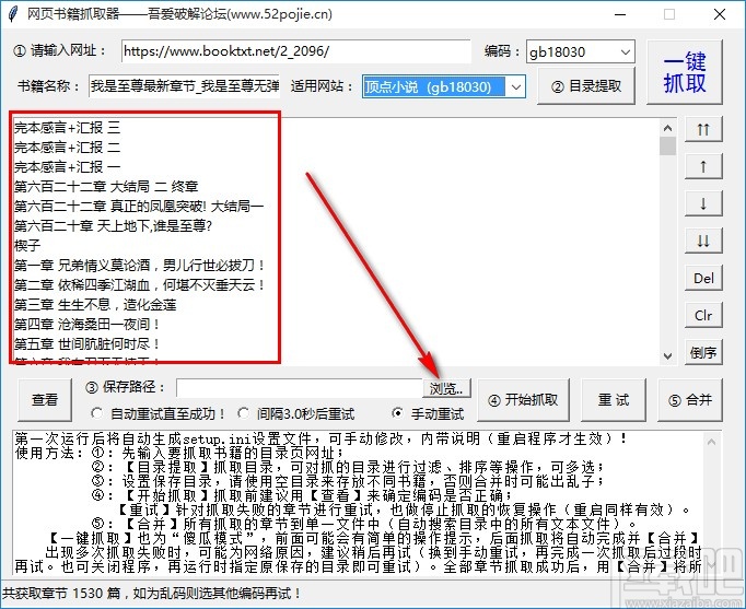 4.等到抓取完成之后,我们在界面中就可以看到网页中抓取得到的一些小说章节,然后我们点击下方保存路径右边的浏览按钮。