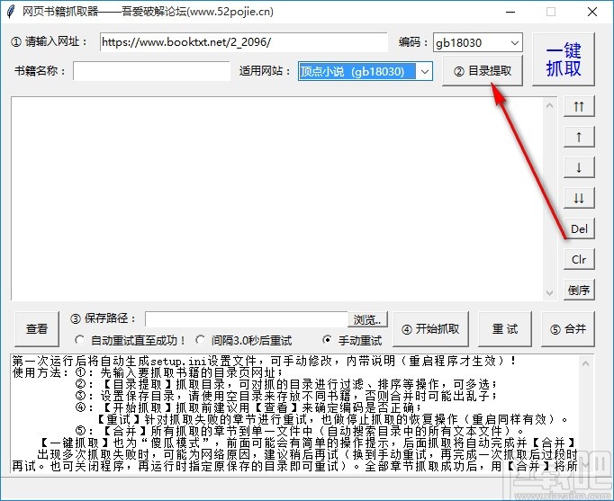 3.选择之后下一步我们就可以点击界面右边的这个目录抓取按钮来开始抓取该网页中的小说目录了。