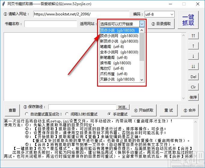 2.将目标小说网页链接复制到软件之后,下一步我们需要点击适用网站选项右边的下拉列表,选择这个目标网页所属的小说网站。