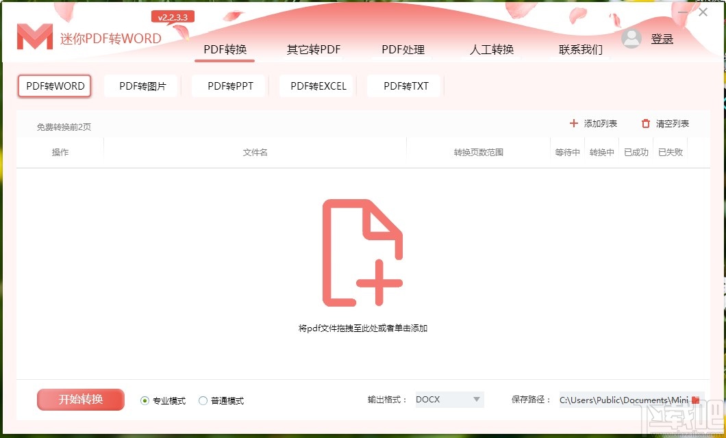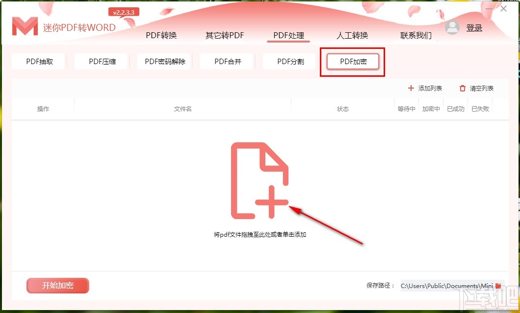 迷你PDF转WORD是一款功能丰富且非常实用的PDF文件转换工具,通过这款转换软件我们可以在电脑上对PDF文件进行格式转换、加密、解密等操作,都是能够很好的帮助用户完成PDF文件处理的,当我们编辑好PDF文件之后,肯定会需要用到加密的功能,将文件加密之后对文件的内容保护就更有保障了,那么使用迷你PDF转WORD这款软件也是可以加密PDF文件的,接下来小编就跟大家分享一下使用这款软件加密PDF文件的具体操作方法吧,感兴趣的朋友不妨一起来看看这篇方法教程。