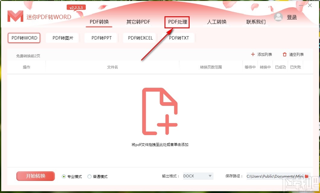1.首先第一步我们打开软件之后点击界面上方的这个PDF处理功能,点击切换到PDF处理功能界面中。