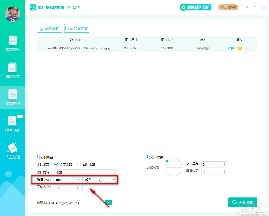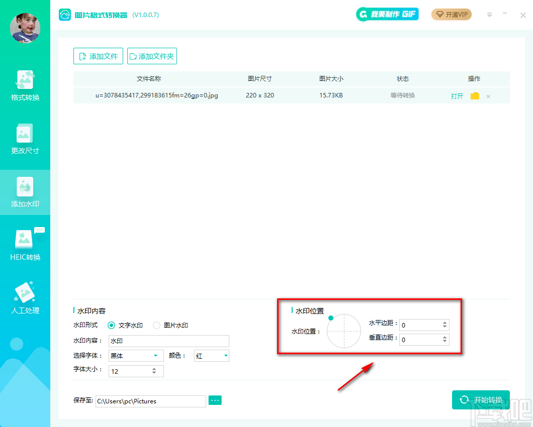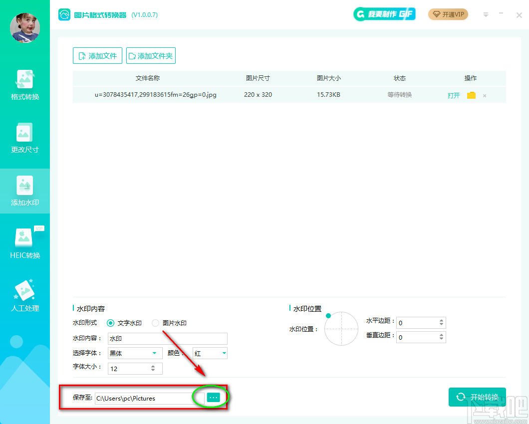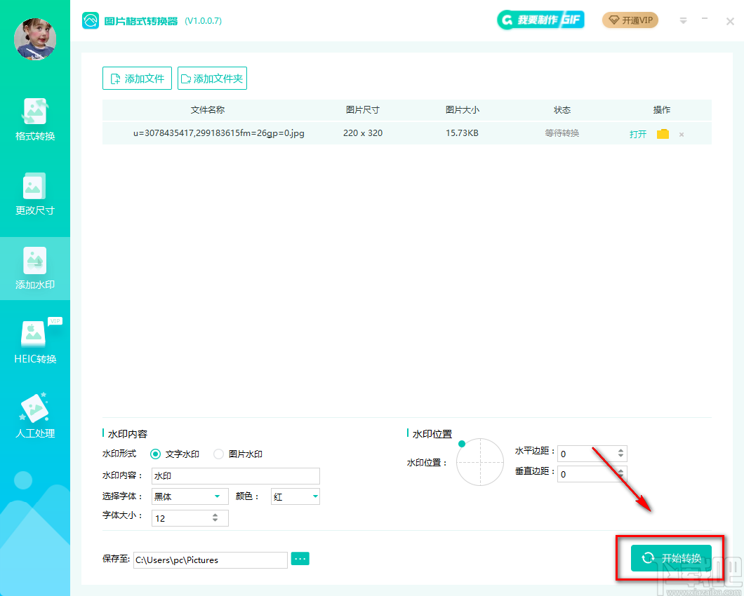 10.完成以上所有步骤后,我们在界面右下角找到绿色的“开始转换”按钮,点击该按钮就可以开始给图片添加文字水印并将其保存在指定的文件夹中。