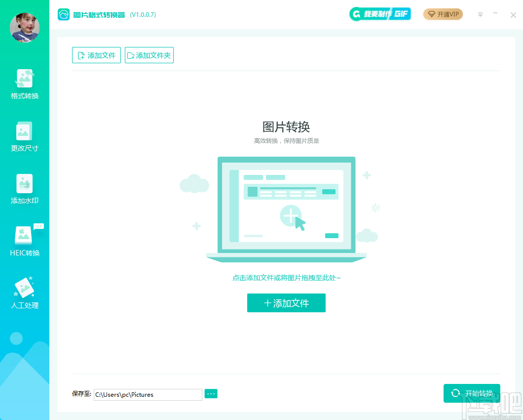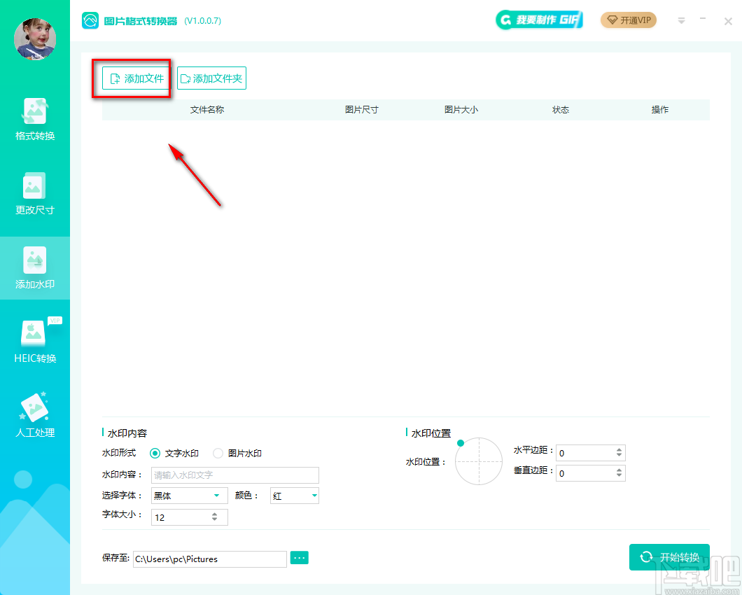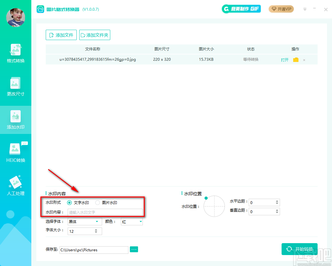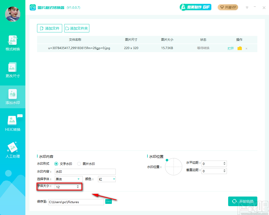10.完成以上所有步骤后,我们在界面右下角找到绿色的“开始转换”按钮,点击该按钮就可以开始给图片添加文字水印并将其保存在指定的文件夹中。