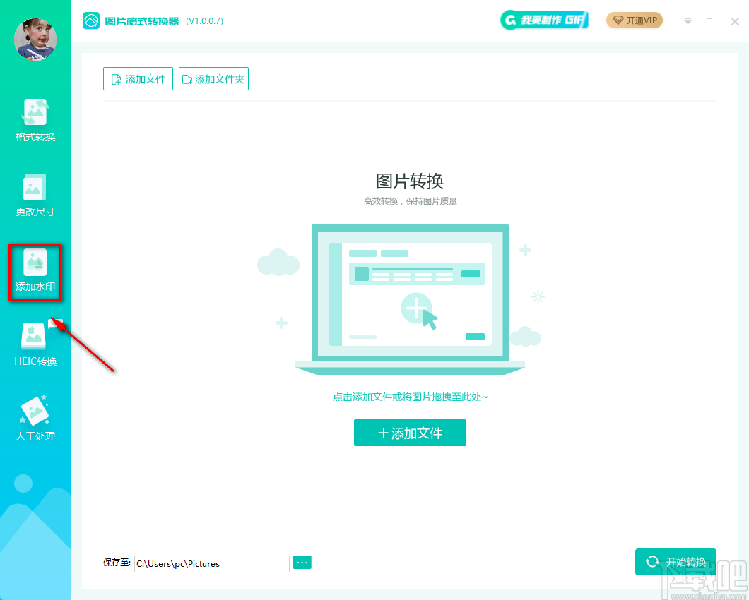 1.首先打开软件,在界面的左侧找到“添加水印”选项,我们点击该选项,界面右侧就会出现相应的操作选择。