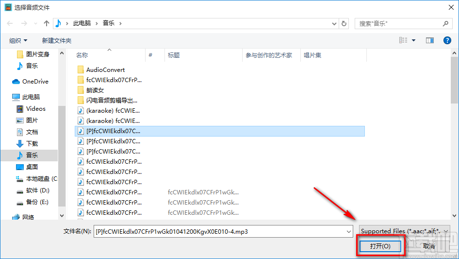 5.在音频文件添加页面中,我们找到需要添加到视频中的背景音乐后,再点击页面右下角的“打开”按钮即可将音频文件添加到软件中。