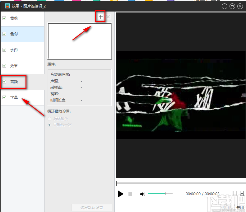 4.在效果设置页面中,我们在页面左侧找到“音频”并勾选,再点击页面顶部的加号图标按钮进入到音频文件添加页面。