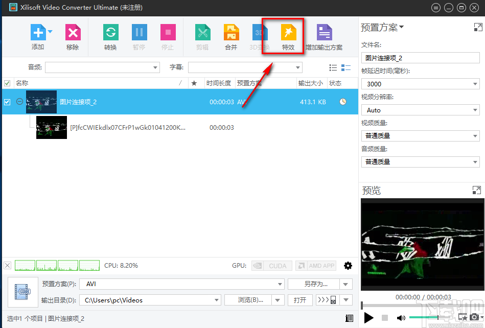 3.将文件添加到软件后,我们在界面顶部找到“特效”选项,点击该选项进入到效果设置页面。