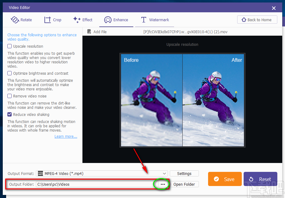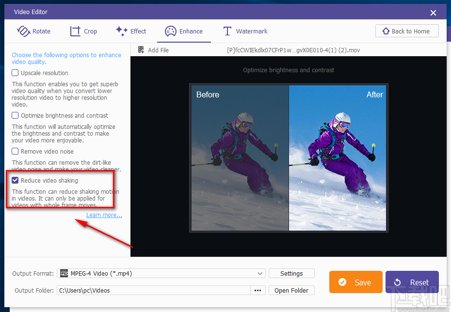 4.将文件添加到软件后,我们在界面左侧找到“Reduce video shaking”选项,该选项表示给视频减震的意思,点击该选项使其前面的小方框打钩。