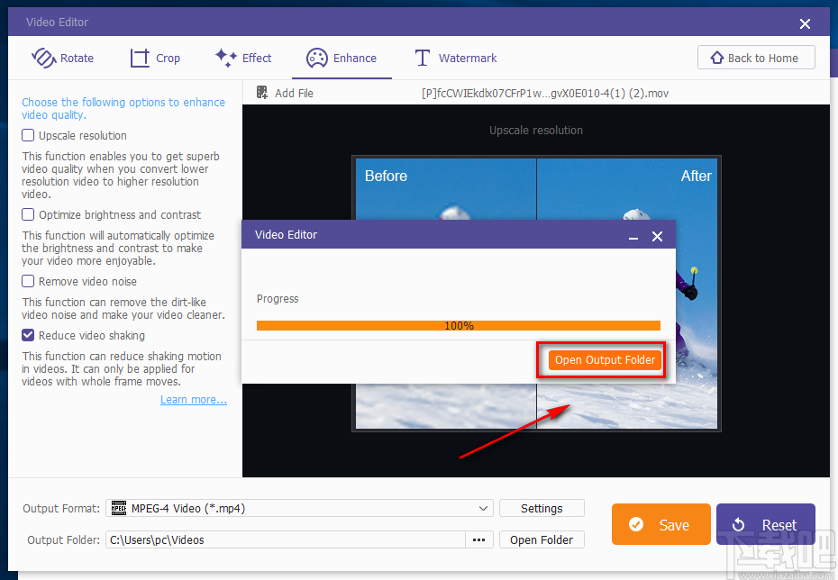 8.给视频减震的速度非常快,减震过程中,界面上会弹出一个进度框;任务完成后,我们可以在进度框中查看到进度是100%,还可以点击框中黄色的“Open Output Folder”按钮打开存放目录对文件进行查看。