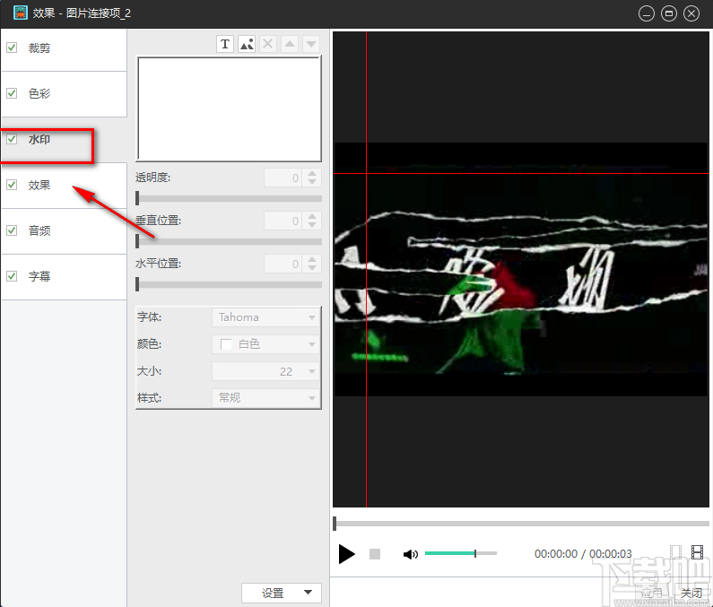 4.在效果设置页面中,我们在页面左侧找到“水印”选项并点击,其旁边就会出现很多相应的操作选择。