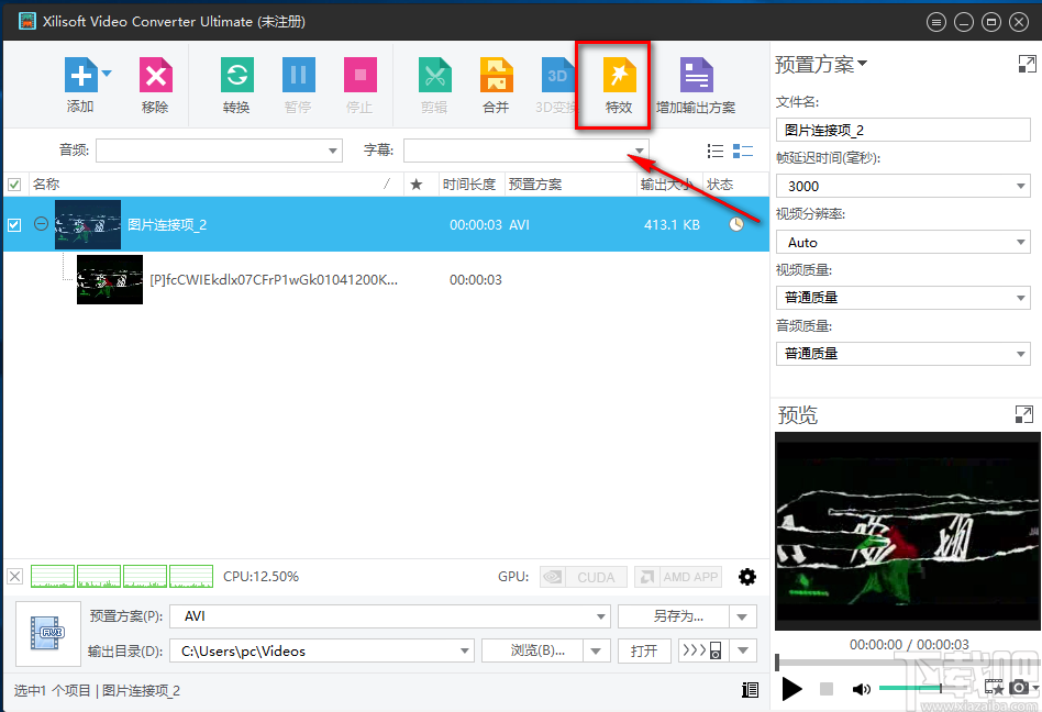 3.将文件添加到软件后,我们在界面顶部找到“特效”选项,点击该选项进入到效果设置页面。