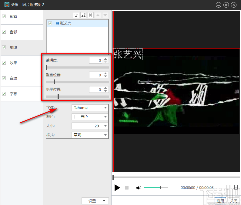 6.然后在文本框下方可以找到“透明度”、“垂直位置”、“水平位置”三个选项,我们可以分别拖动三个选项下方的矩形光标对这几个参数进行设置;也可以分别点击三个选项后面的上下按钮来对这几个参数进行调整。