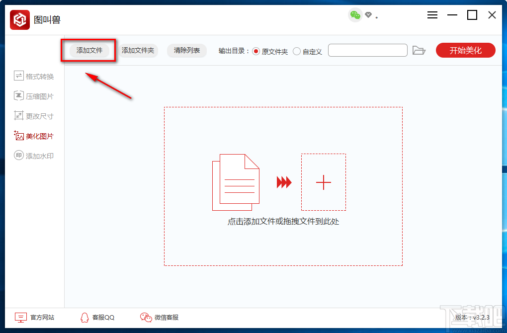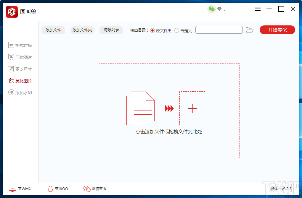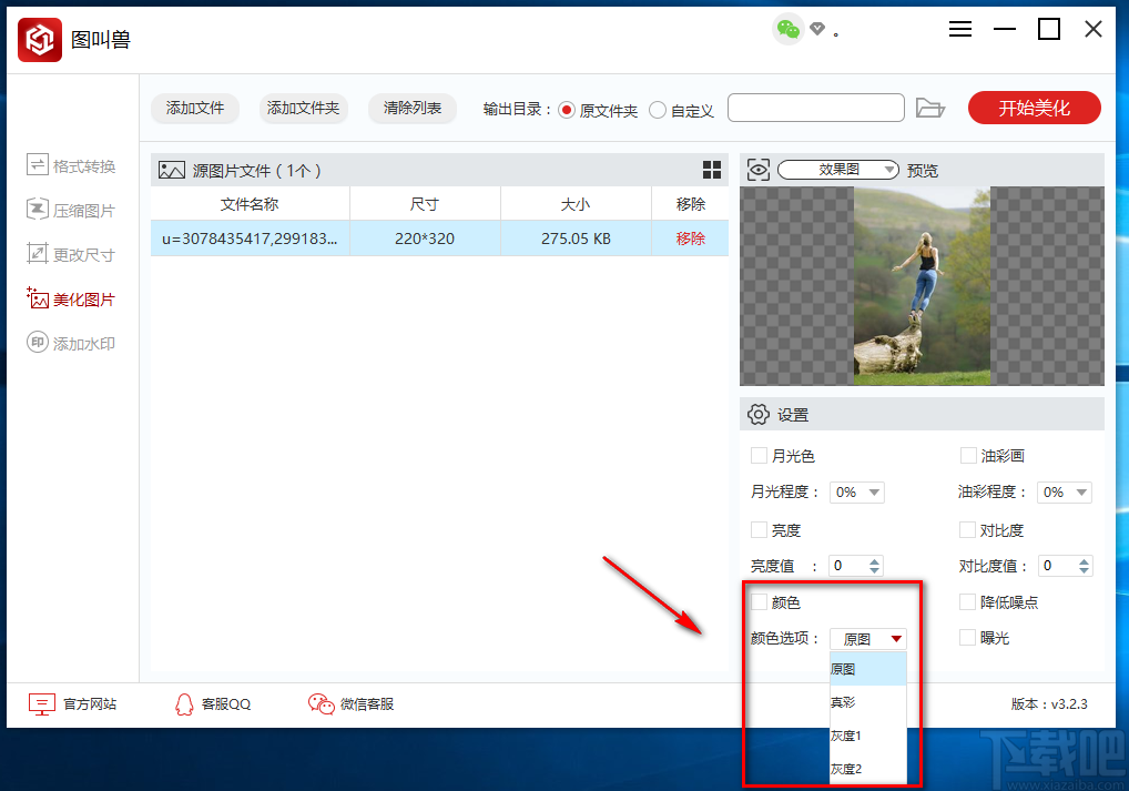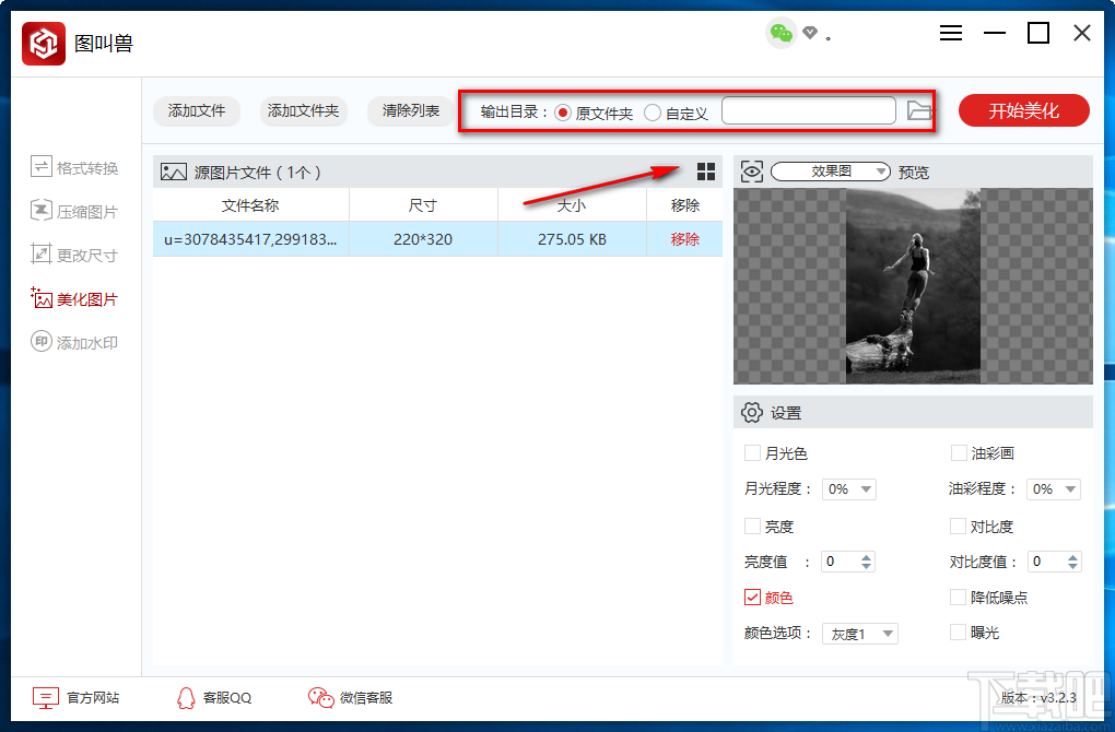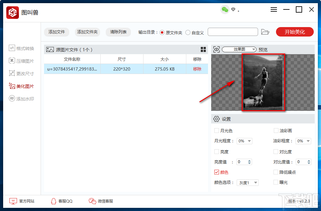 7.完成以上所有步骤后,我们在界面右上角找到红色的“开始美化”按钮,点击该按钮就可以使图片变灰并将其保存在指定的文件夹中。