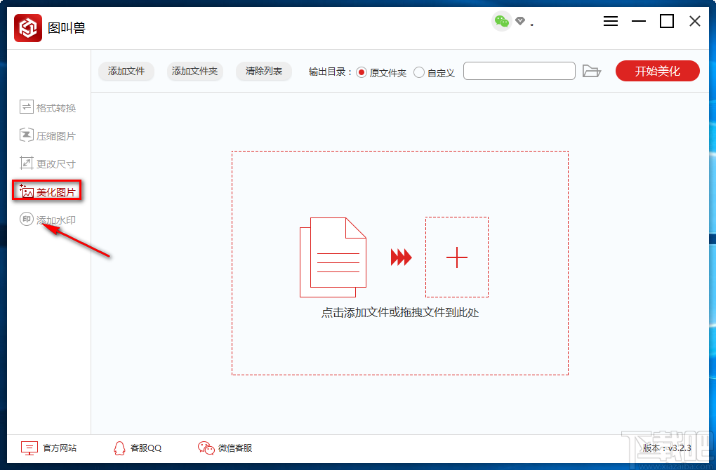 1.首先打开软件,在软件界面的左侧找到“美化图片”选项并点击,界面右侧就会出现相应的操作选择。