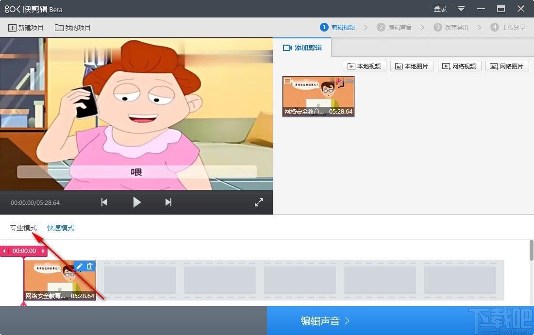 3.点击这个打开按钮,将视频添加到软件界面之后,我们在界面左下方找到专业模式选项,点击之后进入到专业模式当中。