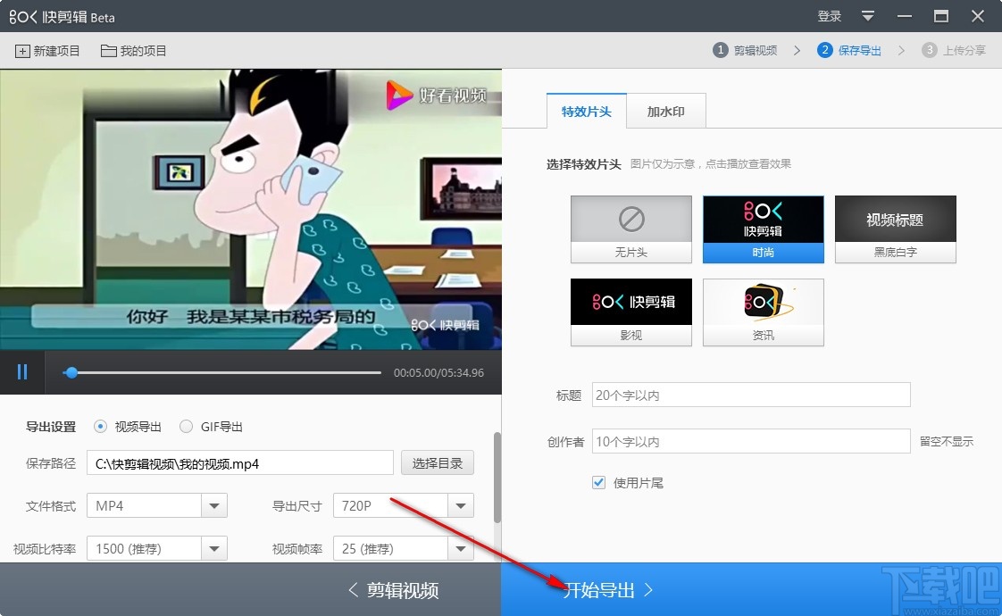 7.点击这个保存导出之后进入到导出视频的界面,我们根据自己的需求对各项参数进行修改设置之后,点击开始导出按钮就可以开始导出视频文件了。