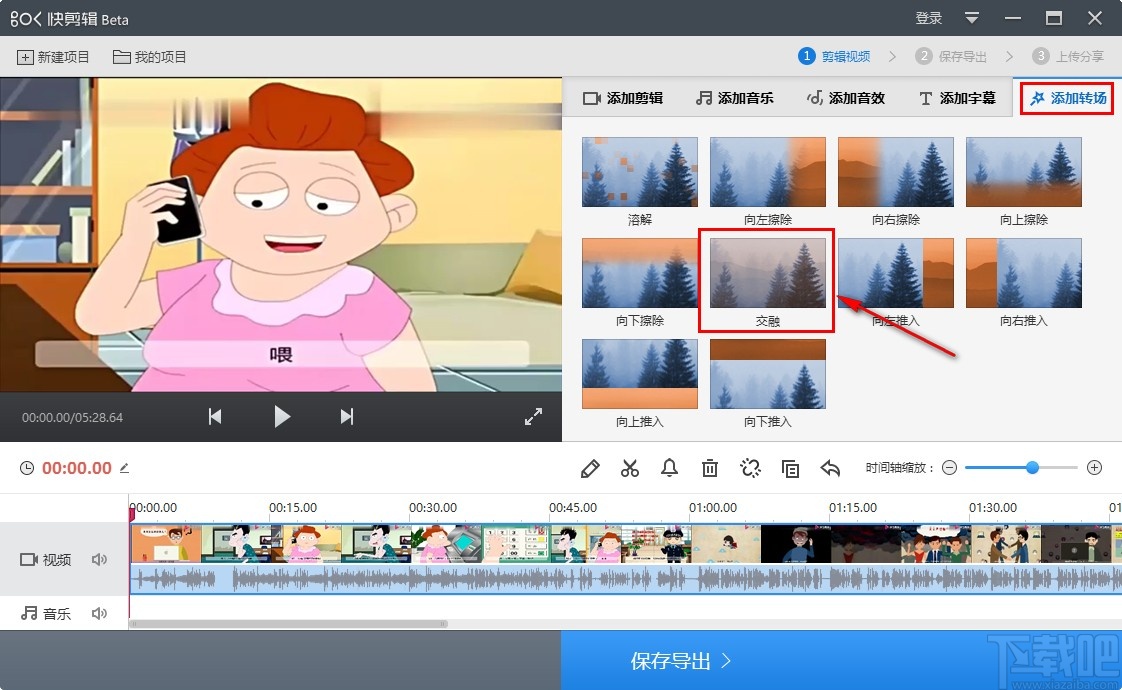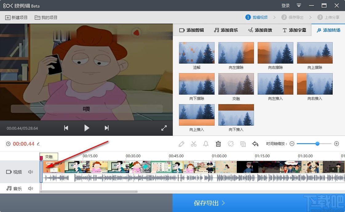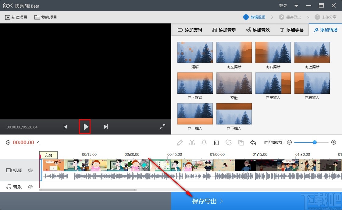 6.之后我们也可以点击界面中的视频播放按钮,点击播放之后可以完整的看到转场效果,满意的话点击保存导出按钮即可。