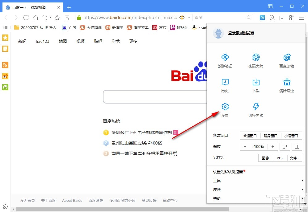 2.点击这个菜单图标之后,我们在出现的菜单界面,找到设置图标之后点击这个设置图标进入到浏览器的设置界面。