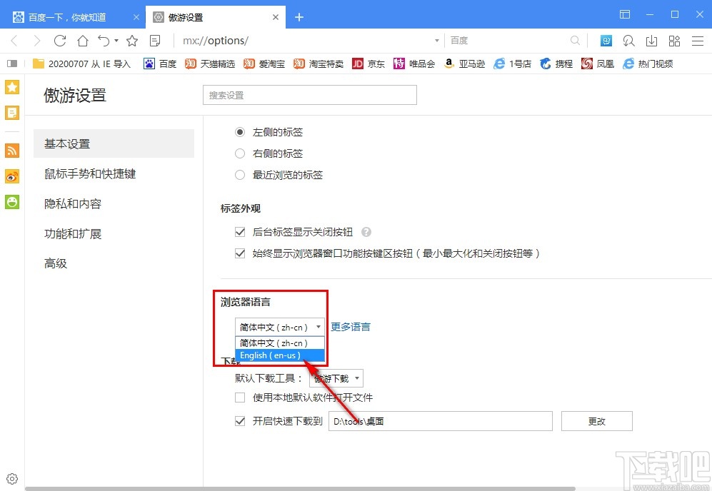3.进入到浏览器的设置界面之后,我们点击基本设置选项界面的下方,找到浏览器语言这个模块,然后点击他的下拉列表选择想要设置切换的浏览器语言。