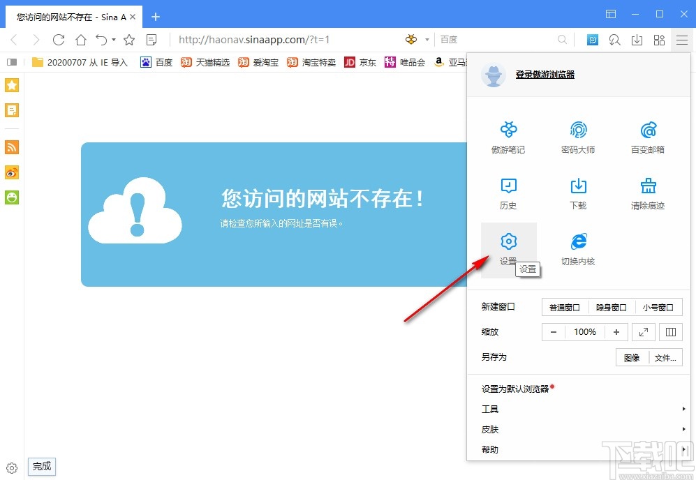 2.出现这个菜单界面之后,我们在菜单界面中找到设置选项,点击之后进入到浏览器的设置界面当中。