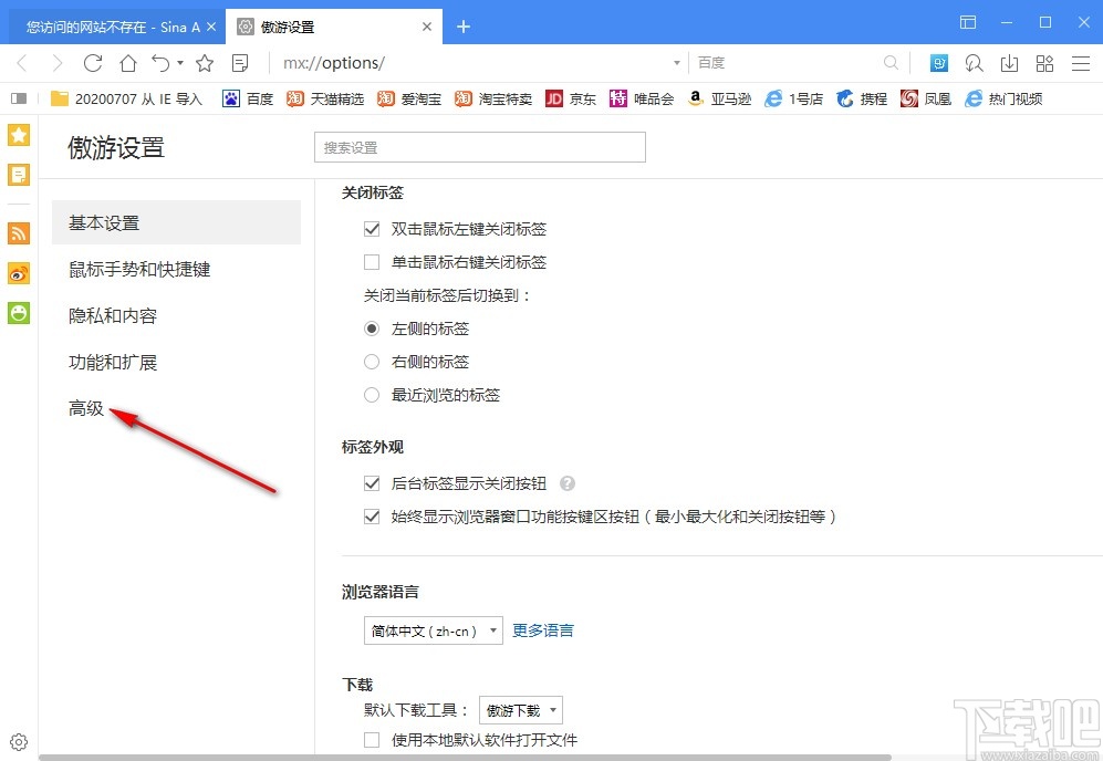 3.点击进入到浏览器的设置界面之后,我们点击界面左边的高级选项,切换到高级设置界面当中。