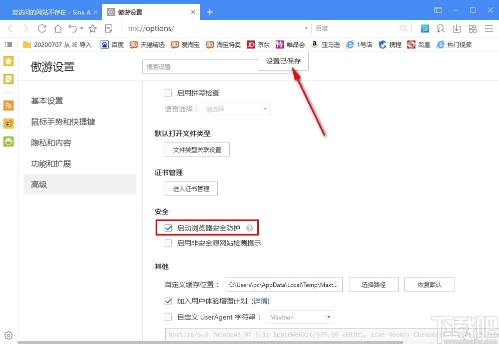 4.最后在高级设置界面我们找到安全这个模块之后,勾选“启动浏览器安全防护”这个功能选项,然后界面上方显示设置已保存就可以了。