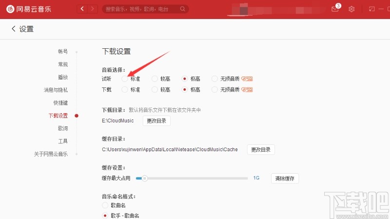 3.切换到下载设置界面之后,我们在音质选择模块即可看到试听这个音质选项,我们在后面可以看到标准选项。