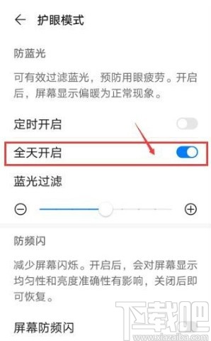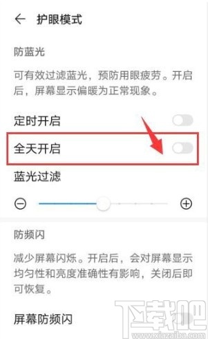 3.点击进入到护眼模式功能界面之后,我们可以看到一个全天开启功能,然后我们点击它后面的开关。