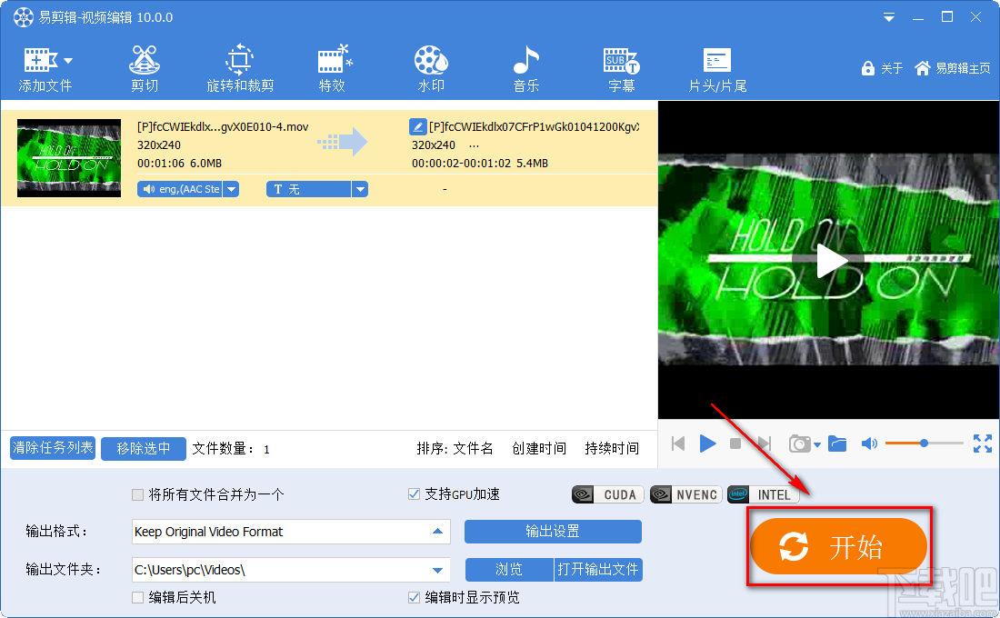 10.完成以上所有步骤后,在界面右下角找到黄色的“开始”按钮,我们点击该按钮就可以开始剪切视频并将其保存在指定的文件夹中。