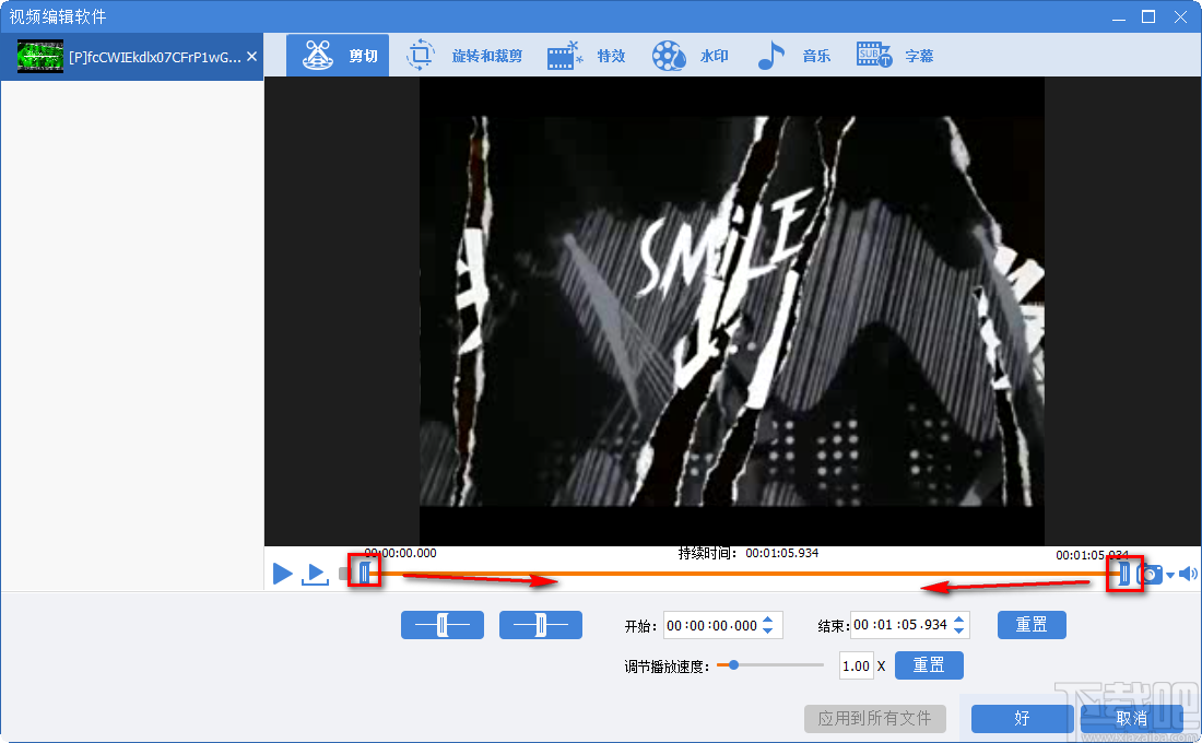 5.在视频剪切页面中,我们在视频预览框下方找到时间进度条,进度条左右两端各有一个小光标,拖动进度条左端的小光标使其向右移动到视频剪切开始的位置;再拖动进度条右边的小光标使其向左移动到视频剪切结束的位置。