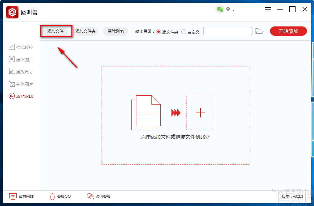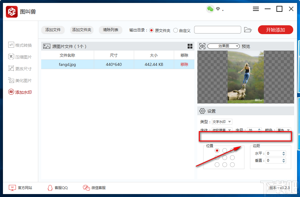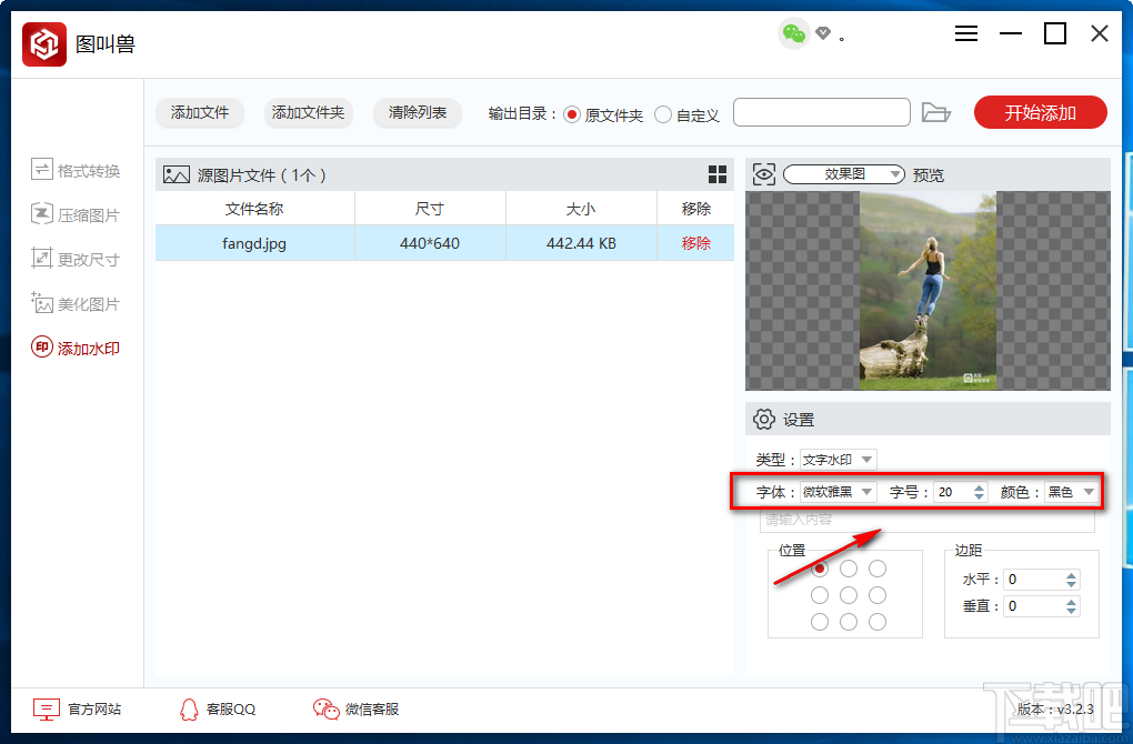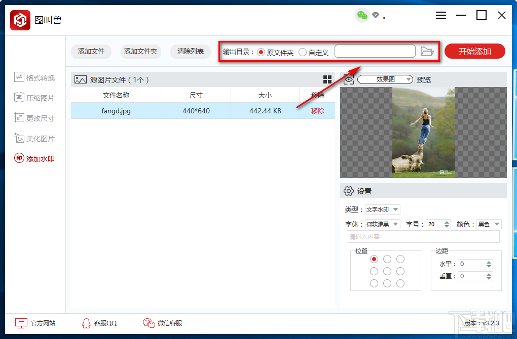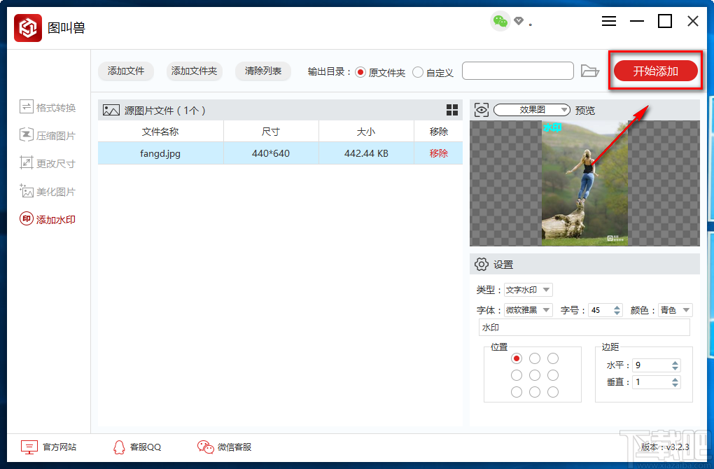 9.完成以上所有步骤后,我们在界面右上角找到红色的“开始添加”按钮,点击该按钮就可以开始给图片添加文字水印并将其保存在指定的文件夹中。