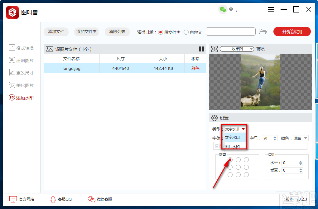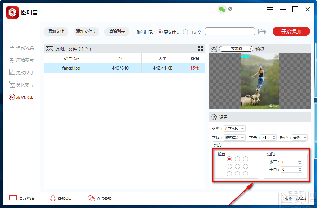 8.接下来在界面右下角找到“位置”和“边距”选项,我们可以在位置选项下方选择水印的位置;还可以分别点击边距选项下方的水平、垂直上下按钮来调整水印在图片中的位置。